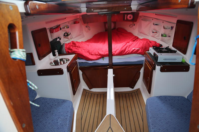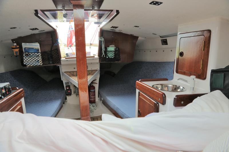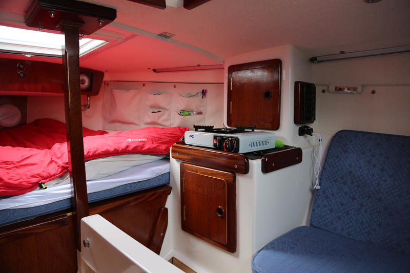 V berth and 2 quarter berths. Sink, camping stove, stowage in cupboards and under berths. Chemical toilet.