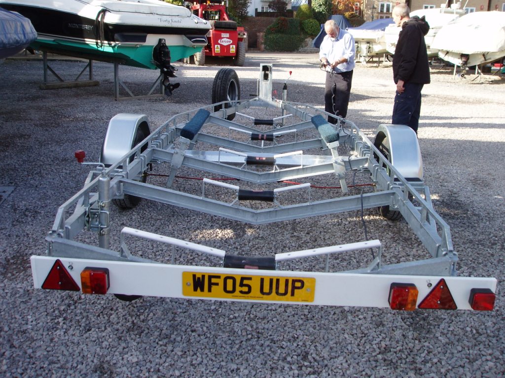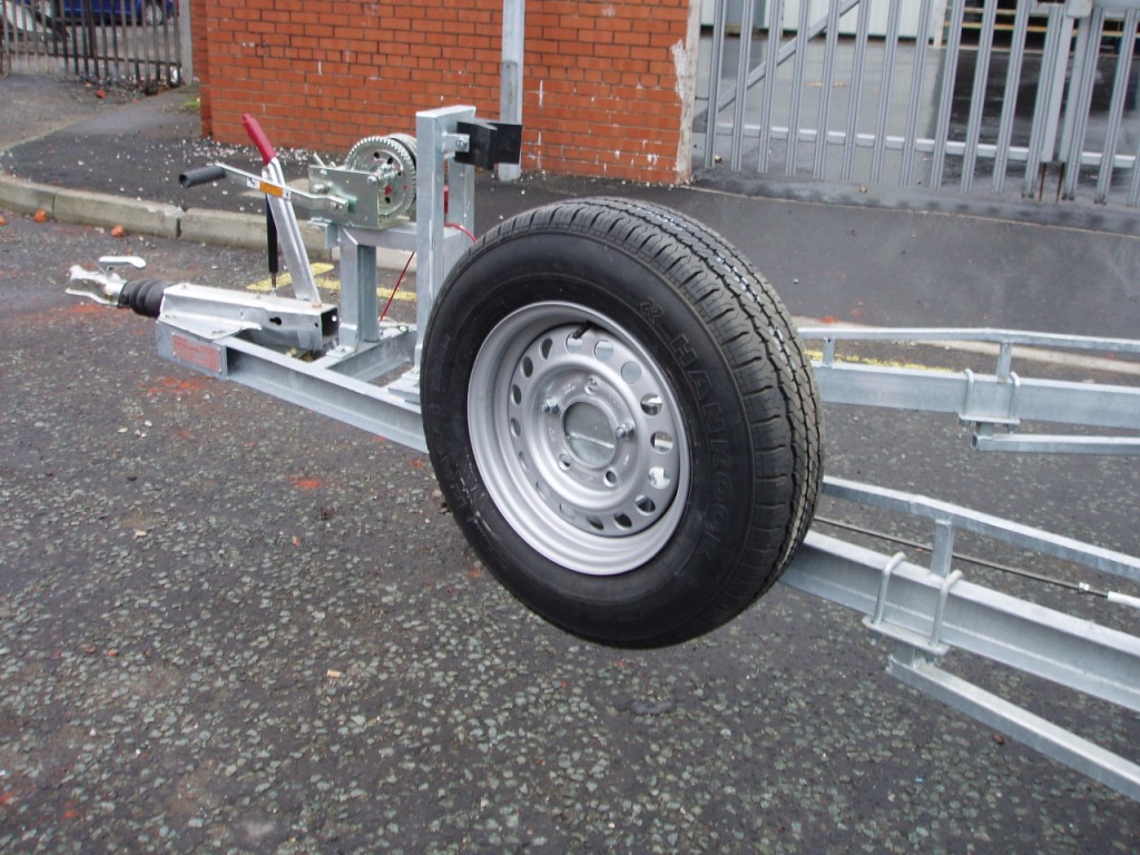 A view of the number board. This is is easily detachable for launching. The original South African design had integral lights which failed following a couple of immersions! The cost of this option is 85.00 including V.A.T. (20.0%), but also includes securing straps, as shown below. This photograph also shows the rear jockey wheel option, this is very useful for manoeuvring the trailer around by hand. It also stops the trailer from tipping up if disconnected from the towing vehicle when rigging when the owner is inside the boat, towards the stern! The cost of the jockey wheel option is 79.50 including V.A.T. (20.0%).