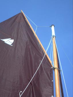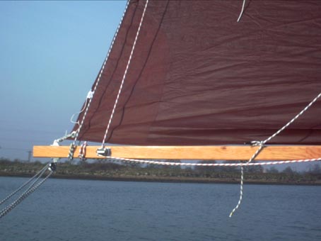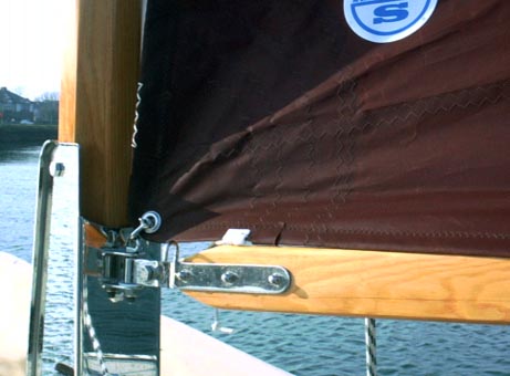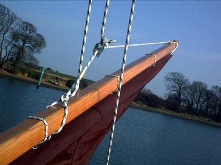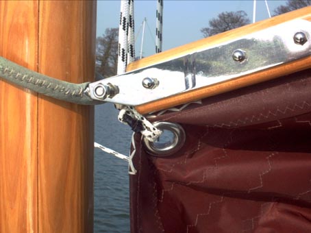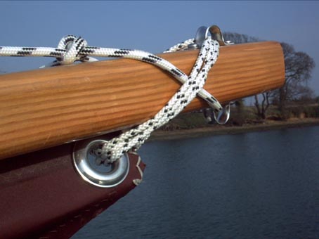 1. The throat of the sail is lashed with a 4 mm lacing line to the shank of the bolt behind the gaff jaw. This lacing should be tight to