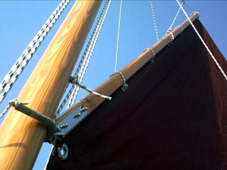 This photo shows the gaff jaw, throat halyard, lacing of sail head to gaff and gaff span attachment.